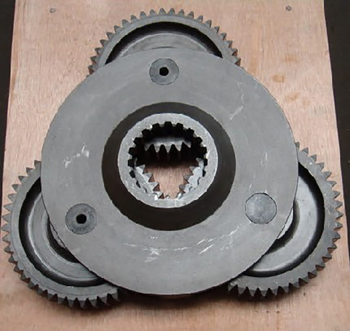 Description: Carrier assembly # 1 for a final drive travel gearbox, completely loaded with carrier housing, 3 planetary gears, 3 bearings, 3 shafts, 3 spring pins, and 6 thrust washers, for a final drive on a Komatsu excavator model PC300LC-7, and many other models. Please check the machine model list.