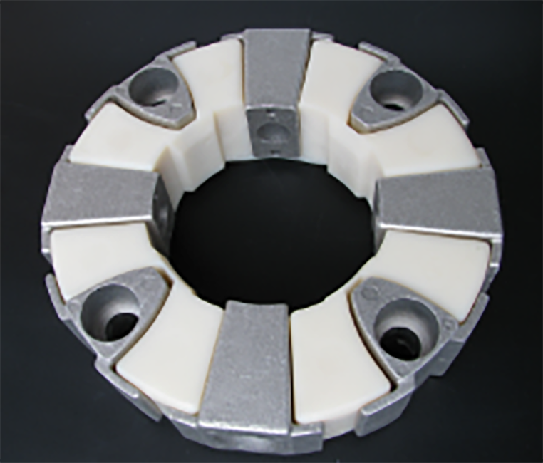 Description: Coupling element sub-assembly for a hydraulic pump on a Kobelco excavator model SK200LC-III. The subassembly includes: the flexible element, and the inserts. It does not include the bolts, set screws, or the center hub.