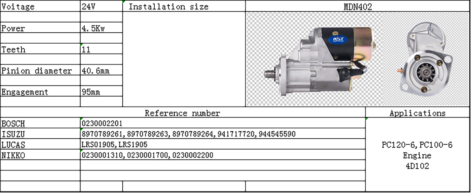Notes: Voltage is 24V. Power is 4.5 Kw. Has 11 teeth, Pinion diameter is 40-6 mm. Engagement is 95 mm. Also replaces the following: BOSCH: 0230002201 ISUZU: 8970789261, 8970789263, 8970789264, 941717720, 944545590. LUCAS: LRS01905, LRS1905. NIKKO: 0230001210, 0230001700, 0230002200. Other part numbers it replaces: 600-863-4210